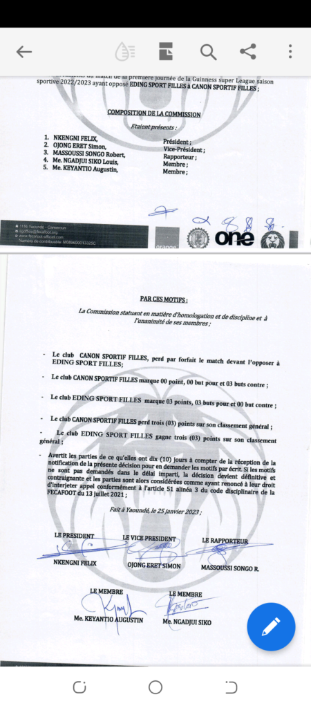 Le Kpa-kum au féminin prend cher. En effet, lors des deux premières journées de championnat, le Canon filles de Yaoundé n’avait pas pu se présenter devant ses adversaires. Englué dans les problèmes internes, le club n’avait pas aligné son équipe notamment contre Ngadeu FF et Eding Sport Filles de la Lekié. La Commission d’homologation et de discipline de la fédération a donc constaté les forfaits du Canon filles de Yaoundé et a confirmé les pertes de ces matchs au profit de ses adversaires et le retrait de six points sur son classement général.