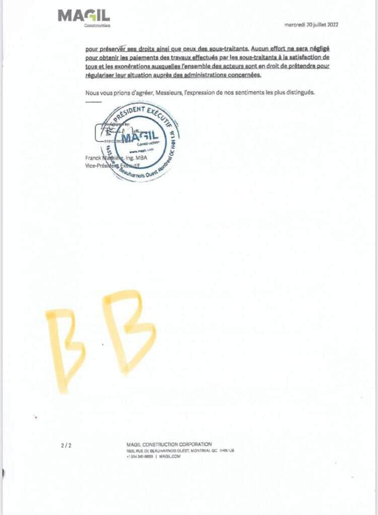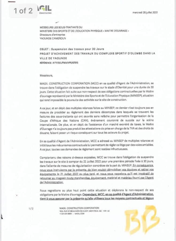 «Magil Construction Corporation (MCC) en sa qualité d’agent de l’administration, se trouve dans l’obligation de suspendre les travaux sur le Stade d’Olembé pour une durée de 30 jours. Cette situation, fait suite aux non-respect de ses obligations contractuelles par le Maitre d’ouvrage représenté par le Ministère des Sports et de Education Physique (MINSEP), situation qui rend impossible la poursuite des activités sur le site de construction.»