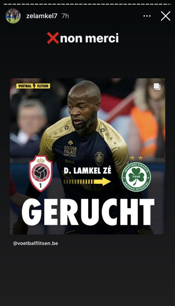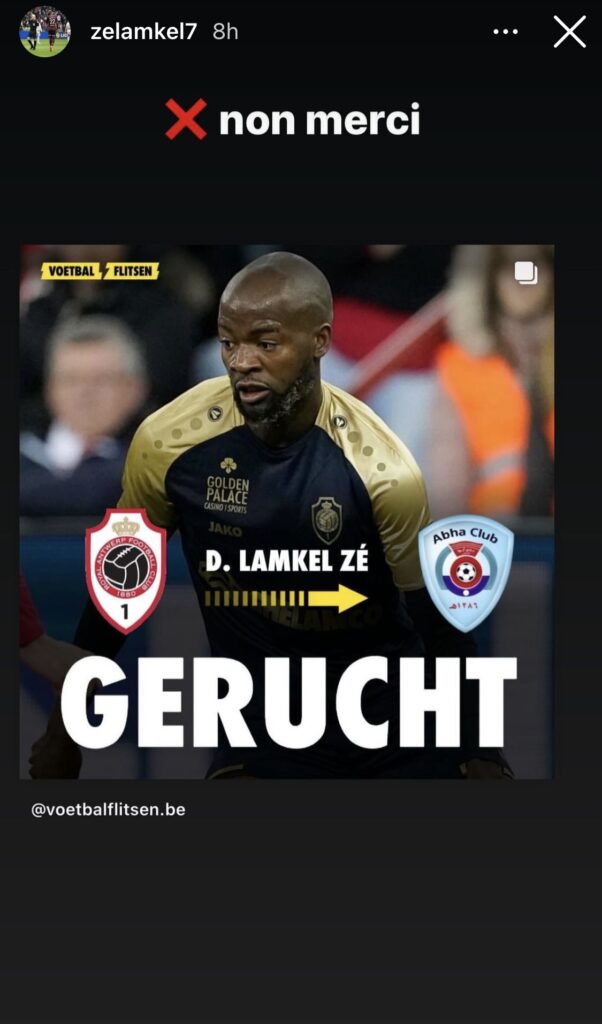 Didier Ze Lamkel (25 ans) n’évoluera pas au Royal Antwerp la saison prochaine. De retour en Belgique après des prêts plutôt réussis en Slovaquie, Russie et France, tout semble indiquer que l’avenir de l’international camerounais s’écrira loin du Bosuil stadion. Mis sur le marché des transferts par la direction dudit club, l’ex joueur de L’Ecole de Football des Brasseries du Cameroun ne manque pas de prétendants. Séduit par sa fin de saison avec le FC Metz (9 matchs et 3 buts), Lamkel Ze faisait l’objet de convoitises de Fenerbahçe et Trabzonspor en début de Mercato. Aujourd’hui, d’après des informations divulguées par Nieuwsbald.be et relayées par Walfoot, le joueur passé par Niort serait courtisé par le club saoudien de Abha, entraîné par Sven Vandenbroeck l’ancien sélectionneur adjoint des Lions Indomptables, et les chypriotes de Omonia Nicosie. Des offres qui m’intéressent pas du temps Lamkel Ze qui n’a pas manqué de le faire savoir sur Instagram par un « Non merci ».