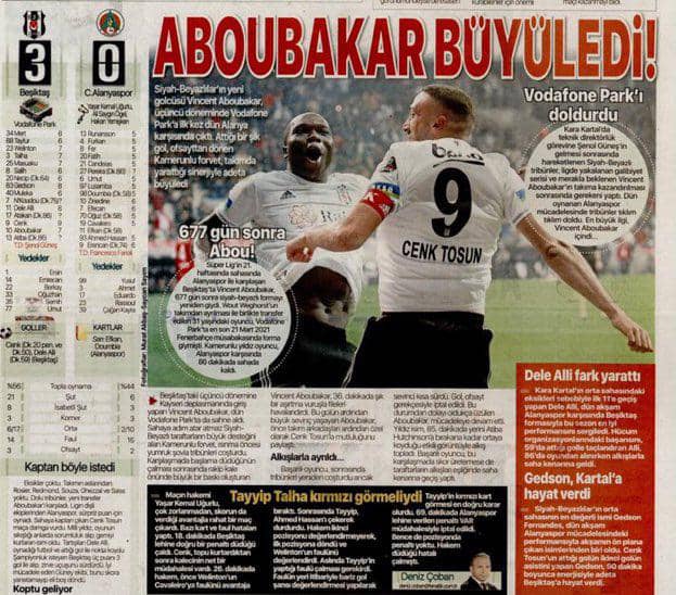 Le nouvel attaquant de Besiktas, Vincent Aboubakar, a fait sa troisième apparition au Vodafone Park pour la première fois contre Alanyaspor hier. L’attaquant Camerounais, auteur d’un élégant but hors-jeu, a fasciné l’équipe par la synergie qu’il a créée’‘, écrit Fanatik en guise d’hommages.